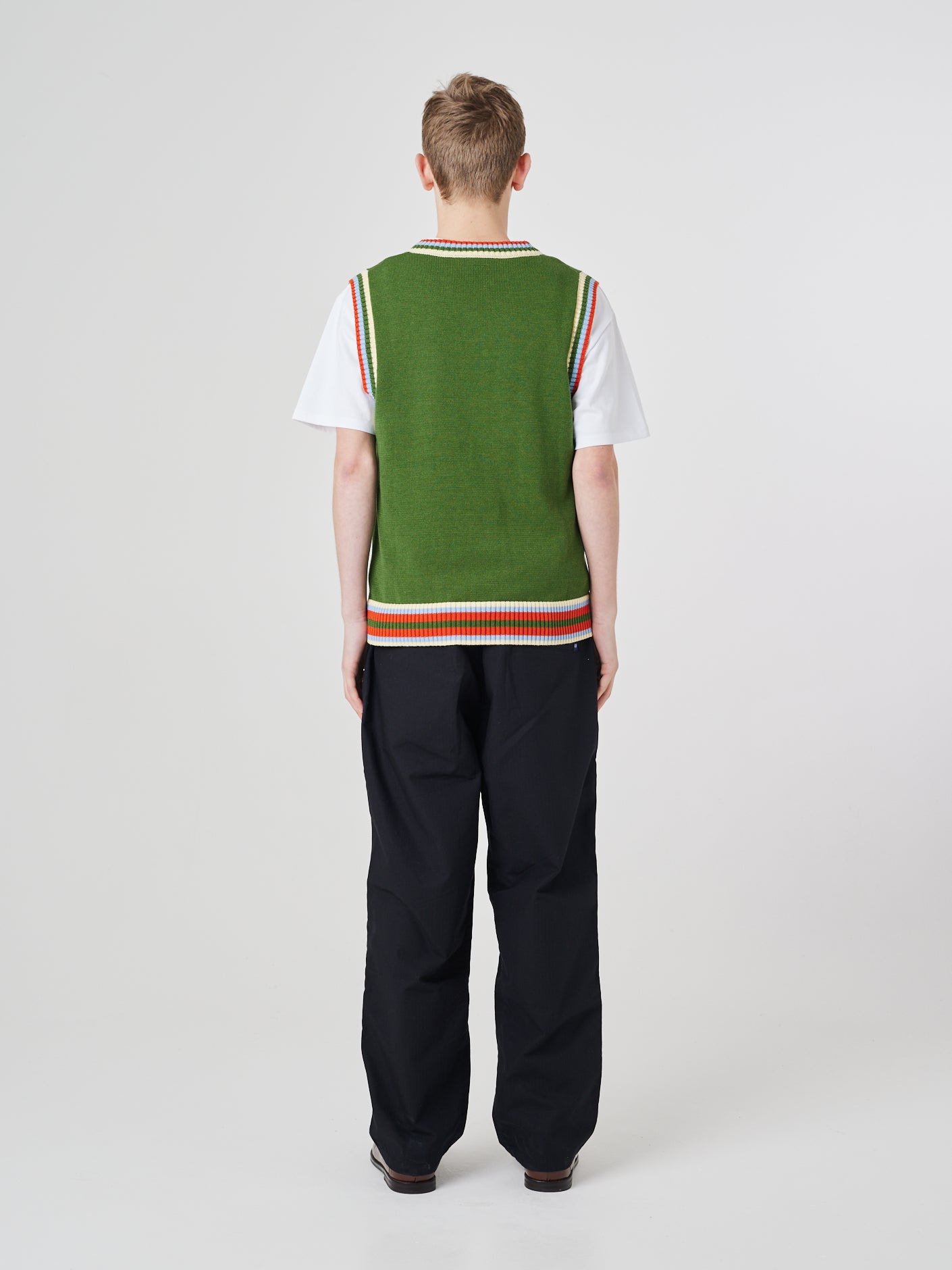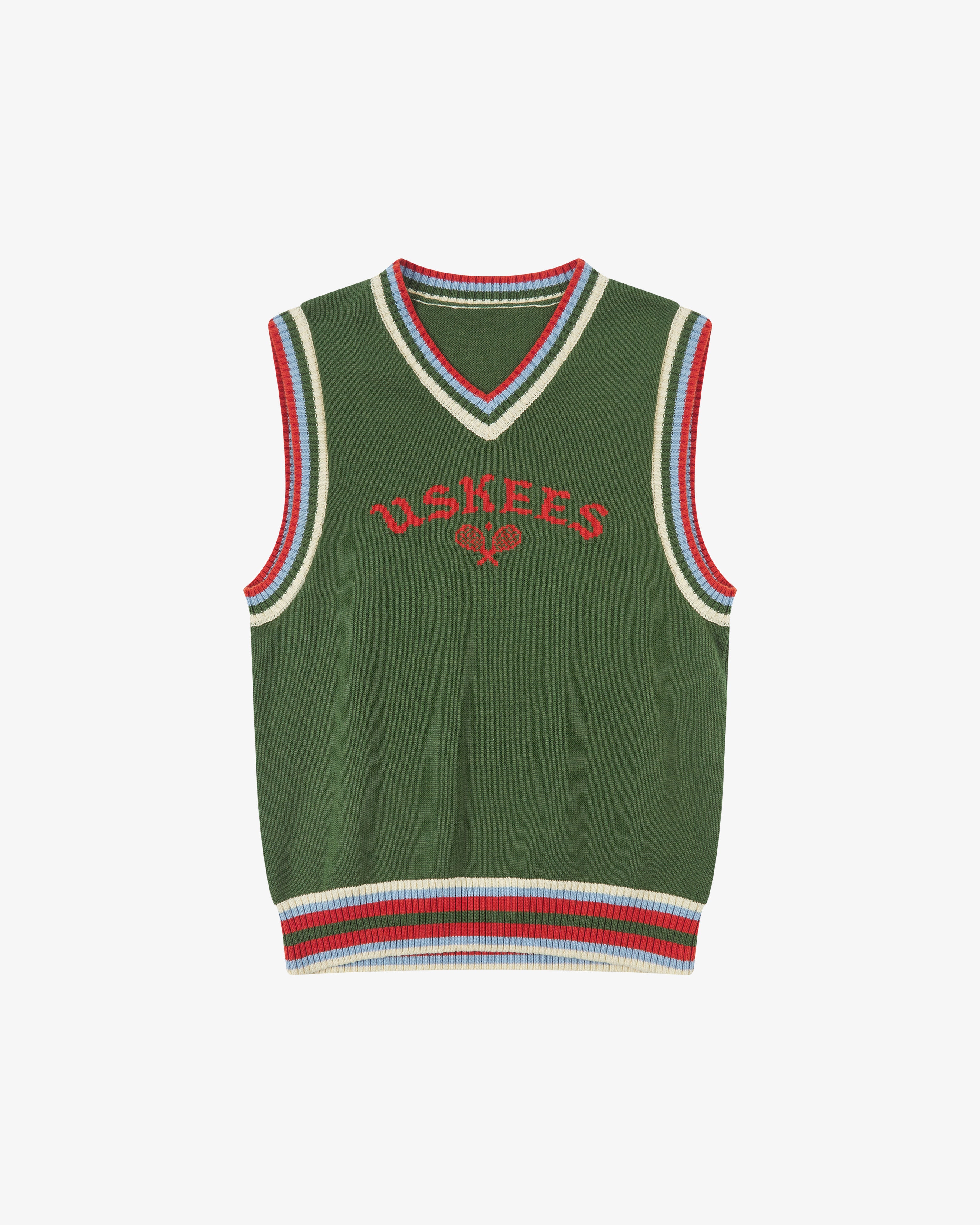 Eine charismatische Neuinterpretation einer Tennisweste aus den 80er-Jahren. Das Modell 7016 vereint die eleganten Rasenschnitte der goldenen Ära der Tennisplätze mit einer dynamischen Welt aus verspielten Farben und Jacquard-Strick.