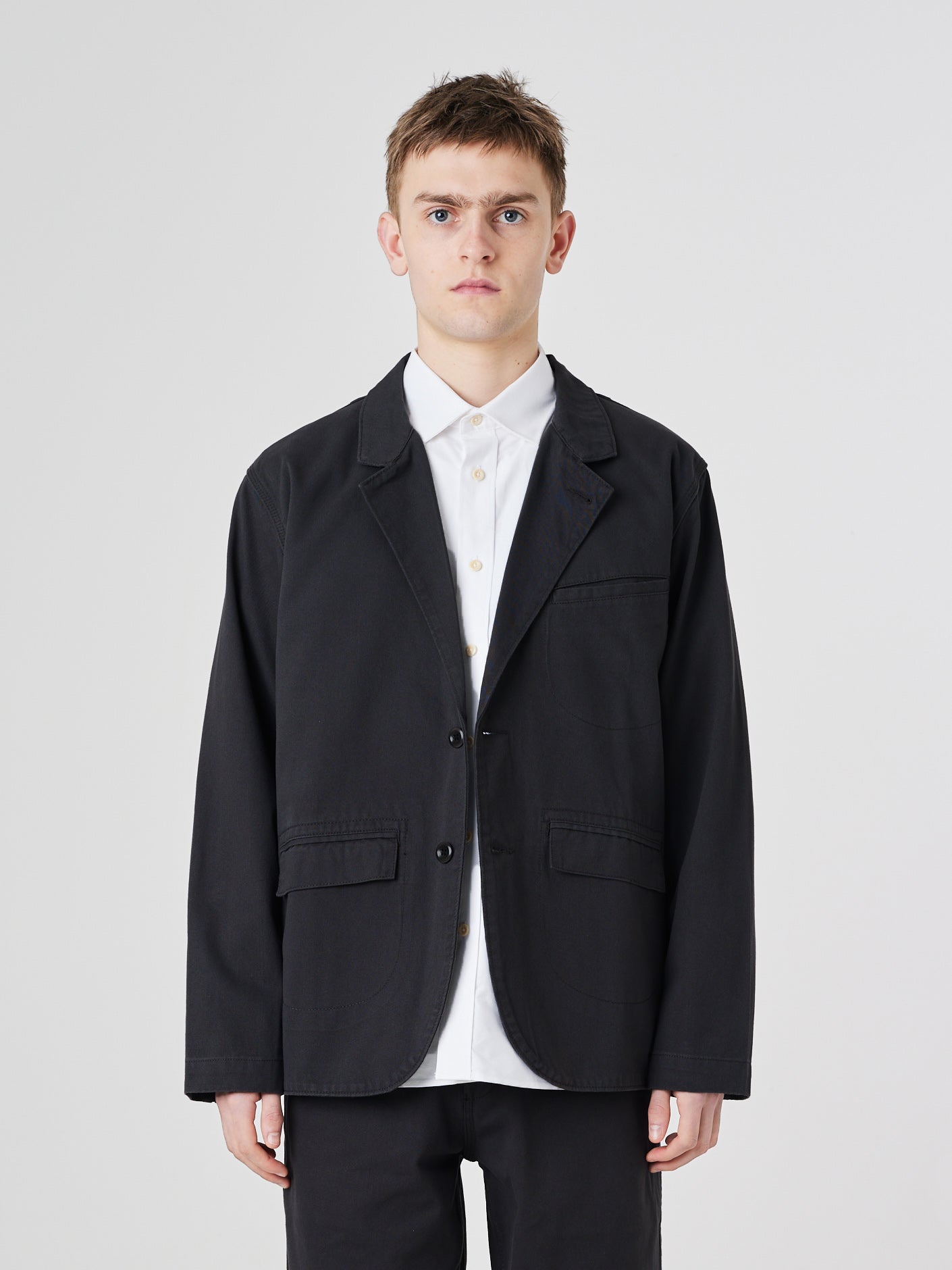 A twill blazer inspired by the hardwearing attire worn by British dockers until the 1960s. The 3047 is a tailored coat of the ports and piers, of the trades club and union office, restyled for today.